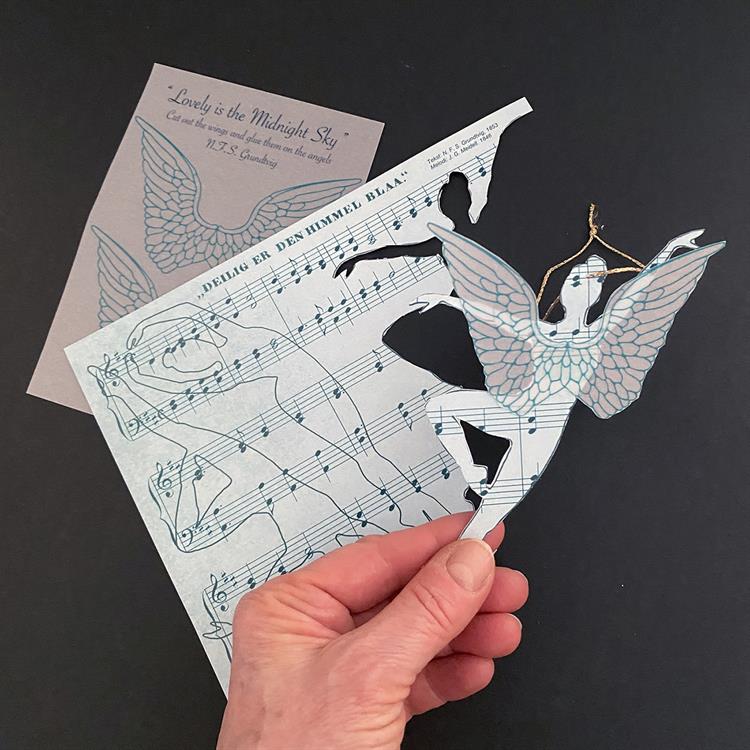 Four dancing angels drawn on the sheet music for the hymn "Lovely is the midnight sky". Written by the Danish priest and author Nikolai Fredserik Severin Grundvig.