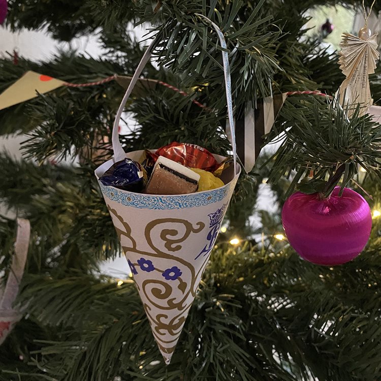 -Cut out the cone, fill it with candy and hang it on the christmas tree.