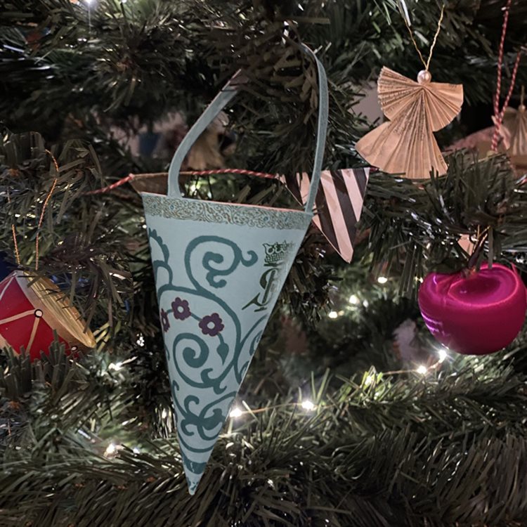 -Cut out the cone, fill it with candy and hang it on the christmas tree.