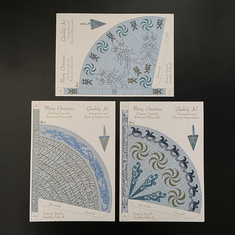 Three Christmas cones with runes, figurs and motifs from scandinavian rune stones.