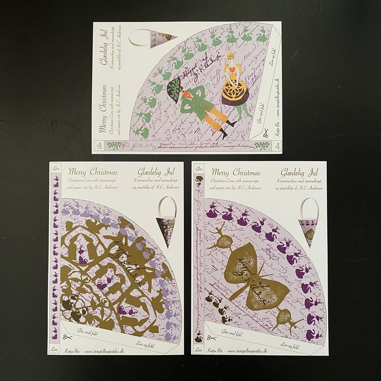 Three Christmas Cones with the original fairy tale manuscript from "The little Mermaid" by Hans Christian Andersen and some of his beautiful paper silhouettes. The dolls on one of the cones was originally made by H.C. Andersen as Christmas decorations for his friend Petrea Scharling.