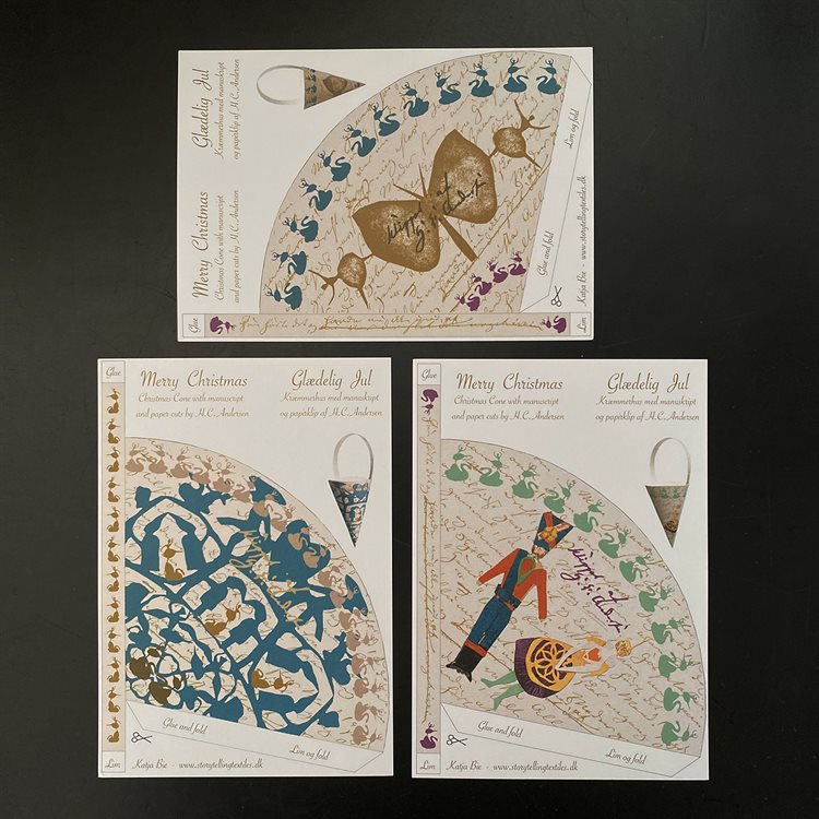 Three Christmas Cones with the original fairy tale manuscript from "The little Mermaid" by Hans Christian Andersen and some of his beautiful paper silhouettes. The dolls on one of the cones was originally made by H.C. Andersen as Christmas decorations for his friend Petrea Scharling.