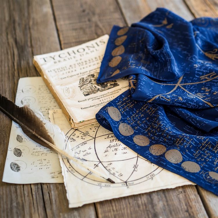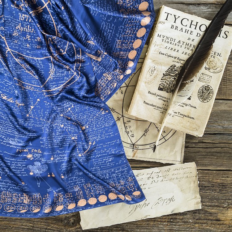 Silk scarf with the original Star carts and astronomical observations by the groundbreaking Danish scientist Tycho Brahe.